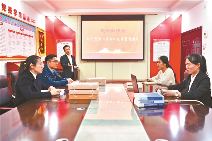 江西省新余市紀委監(jiān)委不斷強化紀檢監(jiān)察干部對執(zhí)紀執(zhí)法貫通理念的理解運用,建立“通報講評”機制,針對實踐中發(fā)現(xiàn)的難點問題及時分析講解,提升案件辦理質(zhì)效。圖為該市紀委監(jiān)委案件審理室圍繞新修訂的紀律處分條例,解讀紀法銜接條款的理解運用。黃磊 攝