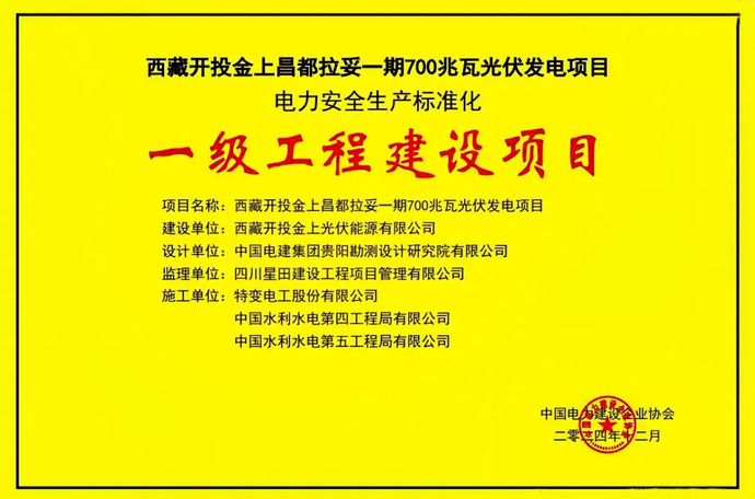 西藏開(kāi)投金上拉妥一期700MW光伏發(fā)電項(xiàng)目于2021年12月13日取得備案批復(fù)文件,2024年12月底主體工程建設(shè)完成,具備并網(wǎng)發(fā)電條件,并于當(dāng)年12月順利通過(guò)電力建設(shè)工程安全生產(chǎn)標(biāo)準(zhǔn)化一級(jí)評(píng)審,榮獲中國(guó)電力建設(shè)企業(yè)協(xié)會(huì)頒發(fā)的“電力安全生產(chǎn)標(biāo)準(zhǔn)化一級(jí)工程建設(shè)項(xiàng)目”榮譽(yù)。