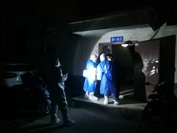 在做好防護(hù)準(zhǔn)備后,扯起嗓門開始耐心的給即將入睡的百姓做起動員。在疫情期間,經(jīng)歷了漫長的等待,蝸居在家的市民大多習(xí)慣了早晚無序的核酸檢測,但還有不少以身體不適、經(jīng)不起“磨煉”等理由進(jìn)行躲避、抗拒,隊員們不厭其煩,只能冒著風(fēng)險逐戶登門做思想工作。舉燈踱步、排門逐戶做完檢測一眨眼三個多小時過去了,再做好試管封裝,數(shù)據(jù)統(tǒng)計、校對后已至子夜后半段,深秋微涼的晚風(fēng)已被隊員的熱情牢牢抵御在防護(hù)服之外。