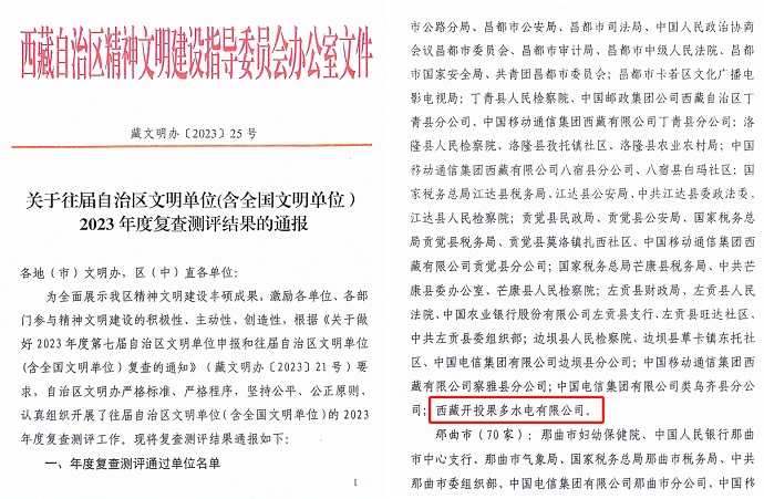 果多水電公司成功續(xù)評第七屆西藏自治區(qū)文明單位