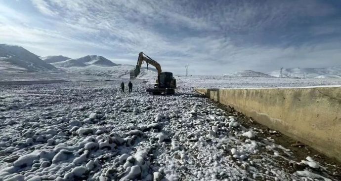 現(xiàn)場工作人員在冰雪覆蓋的灌區(qū)進行清淤工作。