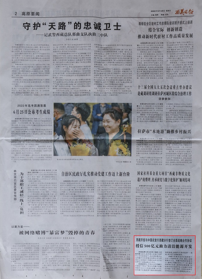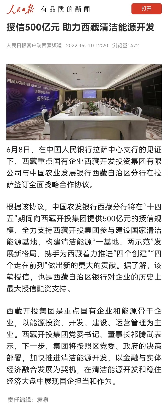 ?。ň幷甙矗?月10日,《人民日報(bào)》客戶端西藏頻道報(bào)道了《授信500億元 助力西藏清潔能源開發(fā)》?!段鞑厝請?bào)》2022年6月10日在第2版“高原要聞”欄目刊登文章,報(bào)道《授信500億元|西藏開投集團(tuán)與中國農(nóng)發(fā)行西藏分行簽訂全面戰(zhàn)略合作協(xié)議》。西藏電視臺(tái)2022年6月10日在西藏電視臺(tái)影視文化頻道《今晚九點(diǎn)》欄目報(bào)道了《授信500億元|西藏開投集團(tuán)與中國農(nóng)發(fā)行西藏分行簽訂全面戰(zhàn)略合作協(xié)議》,《珠峰云》平臺(tái)同步播放。新華網(wǎng)、經(jīng)濟(jì)日報(bào)、西藏衛(wèi)視、西藏日報(bào)客戶端、網(wǎng)信西藏、今日頭條等媒體均報(bào)道了相關(guān)新聞。全文如下: