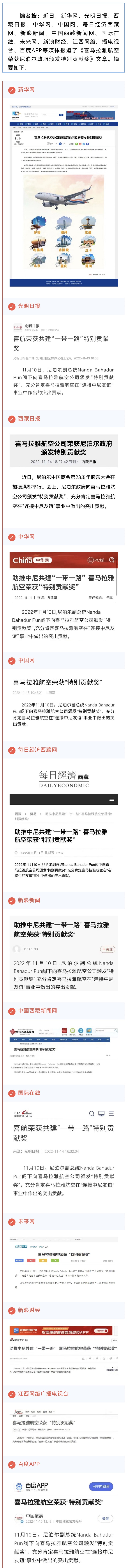 新華網(wǎng)、光明日報、西藏日報、新浪新聞、中國西藏新聞網(wǎng)等13家媒體報道喜馬拉雅航空榮獲尼泊爾政府頒發(fā)特別貢獻獎