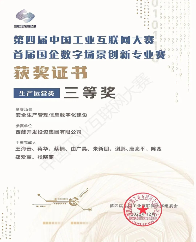 近日,西藏開發(fā)投資集團有限公司在國務院國資委首屆國企數(shù)字場景創(chuàng)新專業(yè)賽中榮獲生產(chǎn)運營類三等獎。