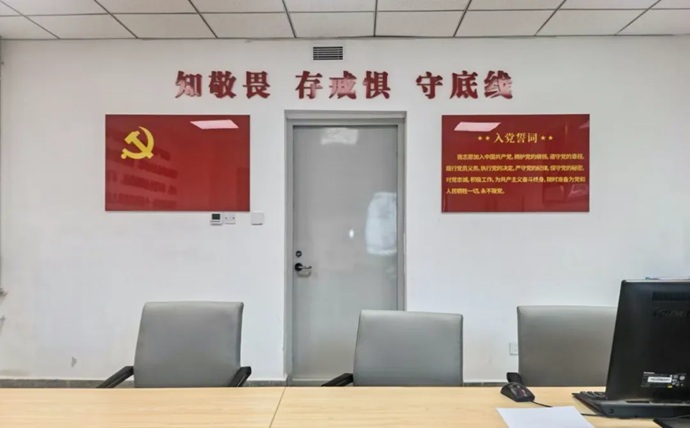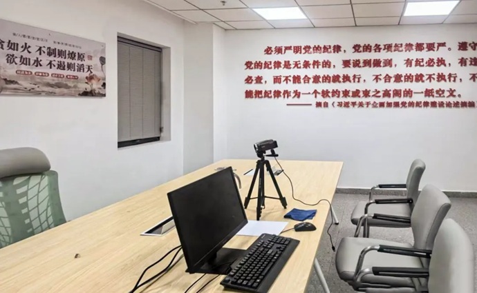 “初心談話室”位于集團(tuán)9樓紀(jì)律檢查部。墻體設(shè)置有黨旗、入黨誓詞,以及習(xí)近平總書(shū)記關(guān)于加強(qiáng)黨的紀(jì)律建設(shè)重要論述摘編等內(nèi)容。室內(nèi)還配有專用辦公電腦、打印機(jī)、光盤(pán)刻錄機(jī)等設(shè)施設(shè)備,實(shí)行全封閉管理,嚴(yán)格執(zhí)行使用登記制度。