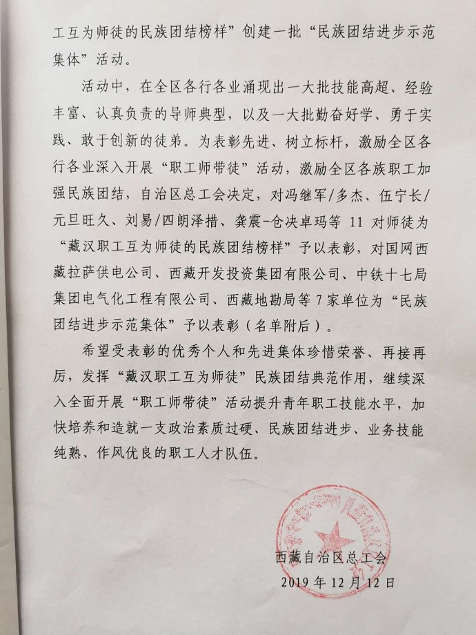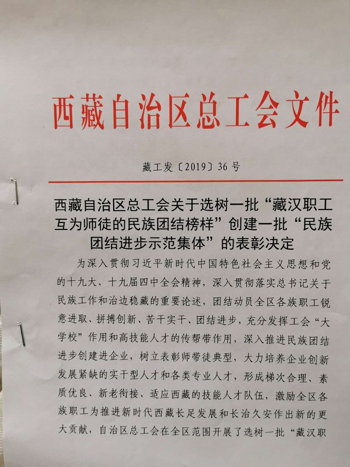 西藏自治區(qū)總工會關(guān)于選樹一批"藏漢職工互為師徒的民族團結(jié)榜樣"創(chuàng)建一批"民族團結(jié)進步示范集體"的表彰決定