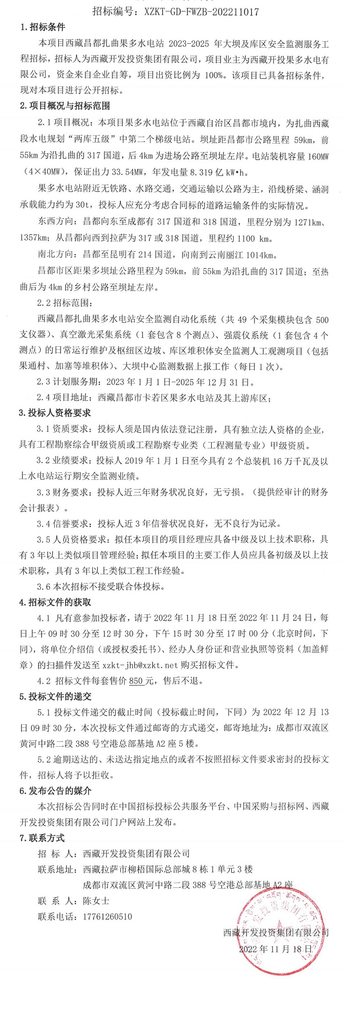 西藏昌都扎曲果多水電站2023-2025年大壩及庫區(qū)安全監(jiān)測(cè)