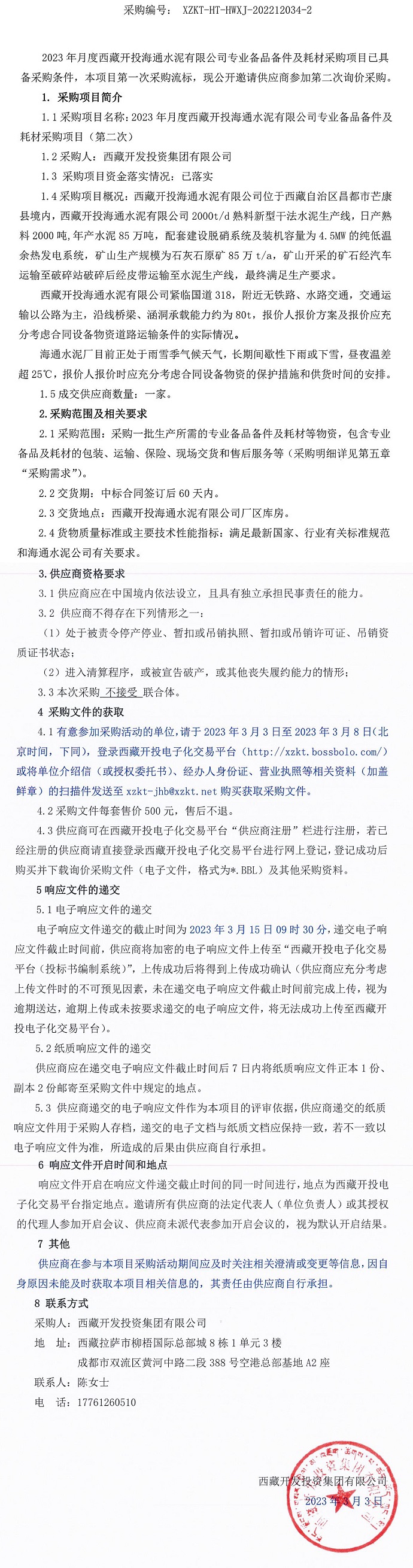 2023年月度西藏開投海通水泥有限公司專業(yè)備品備件及耗材采購項(xiàng)目詢價(jià)采購公告