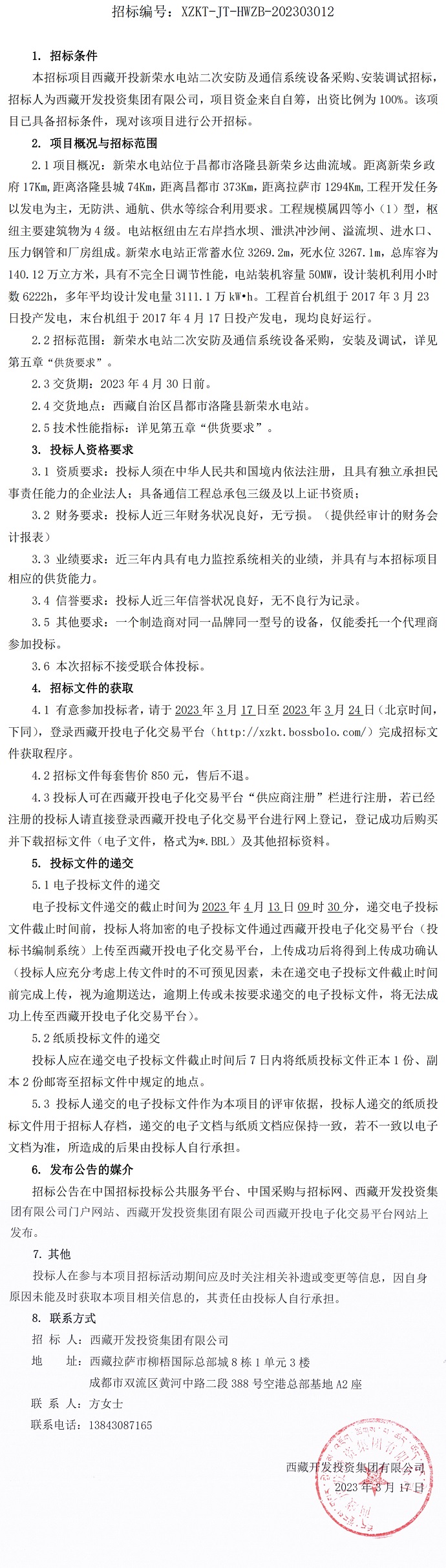 西藏開投新榮水電站二次安防及通信系統(tǒng)設(shè)備采購、