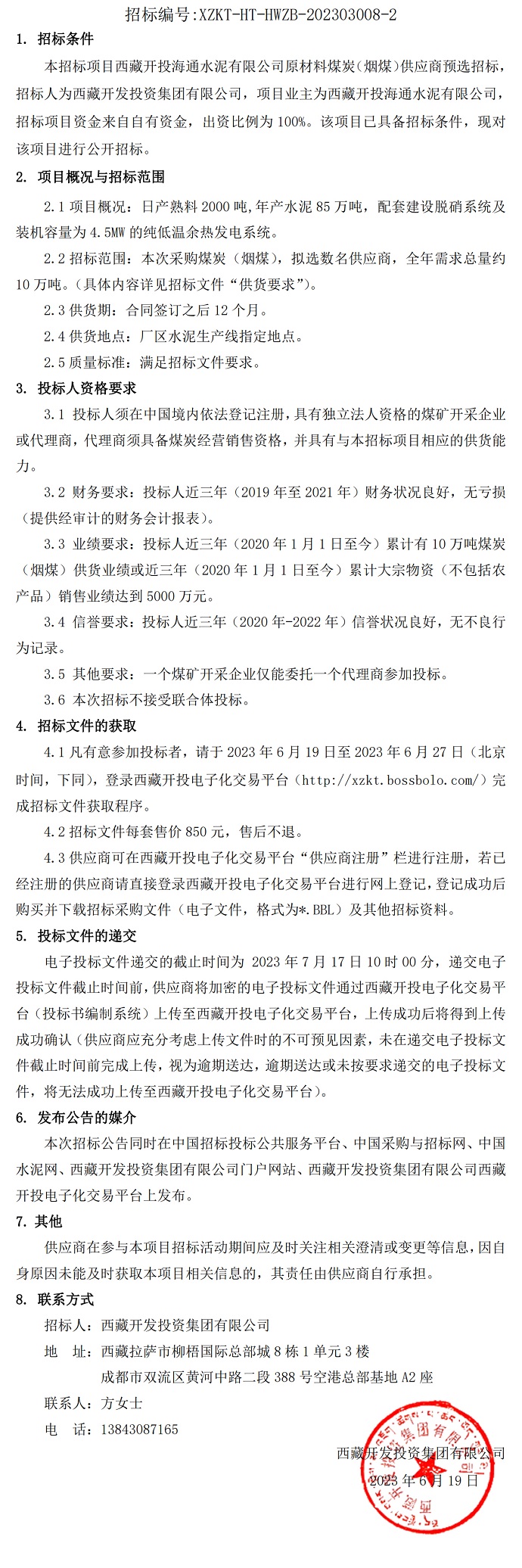西藏開投海通水泥有限公司原材料煤炭(煙煤)供應(yīng)商預(yù)選招標(biāo)公告(二次)