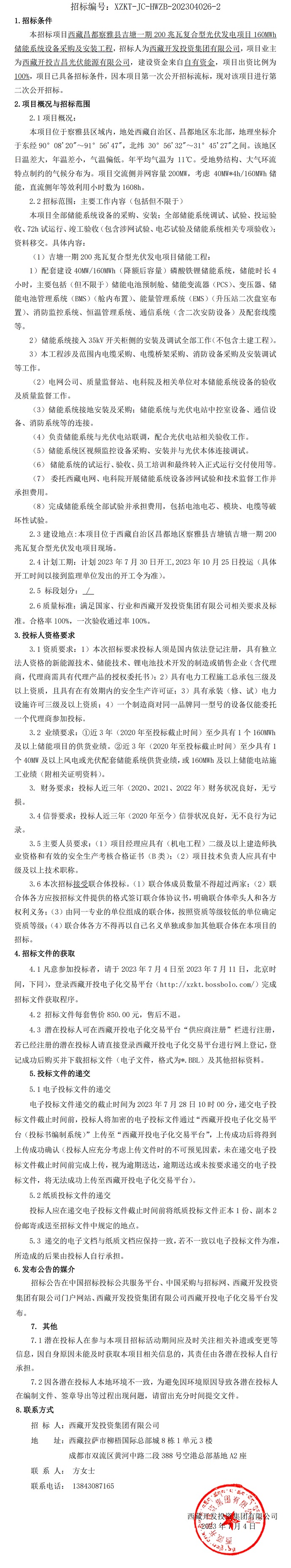 西藏昌都察雅縣吉塘一期200兆瓦復合型光伏發(fā)電項目160MWh儲能系統(tǒng)設(shè)備采購及安裝工程招標公告(第二次)