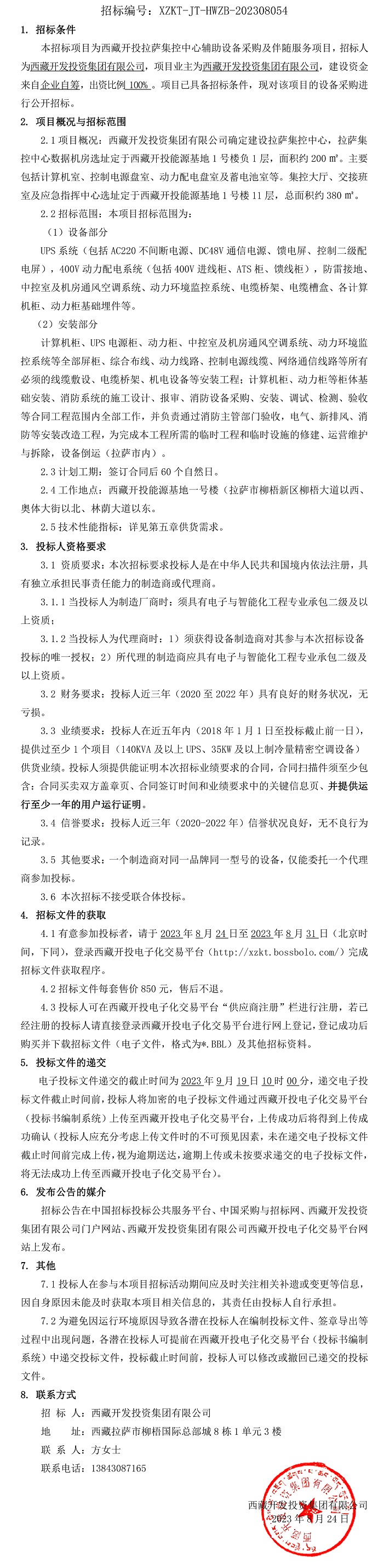 西藏開發(fā)投資集團(tuán)有限公司拉薩集控中心輔助設(shè)備采購及伴隨服務(wù)項(xiàng)目招標(biāo)公告