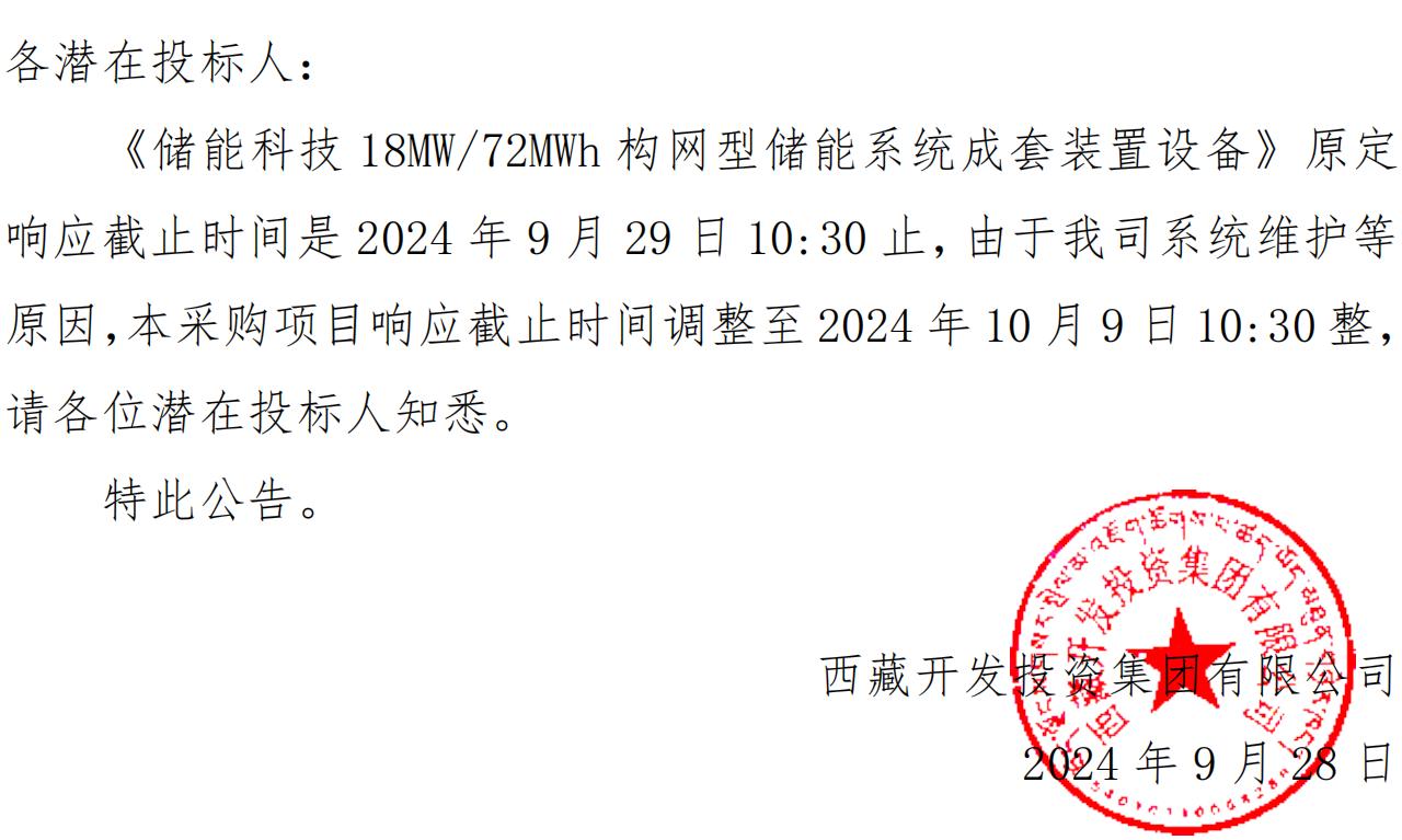 關(guān)于延長(zhǎng)《儲(chǔ)能科技 18MW/72MWh 構(gòu)網(wǎng)型儲(chǔ)能系統(tǒng)成套裝置設(shè)備》競(jìng)爭(zhēng)性談判采購(gòu)響應(yīng)截止時(shí)間的公告