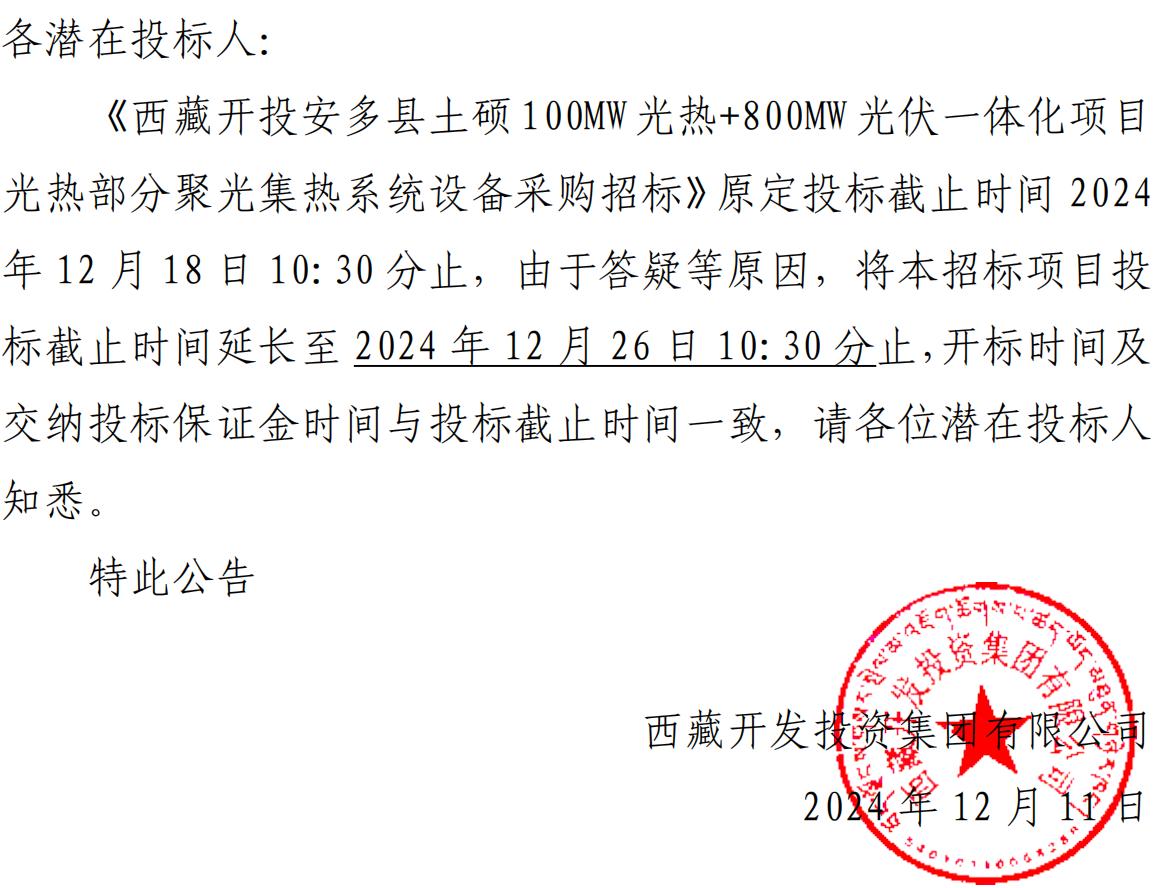 關(guān)于延長(zhǎng)《西藏開投安多縣土碩100MW光熱+800MW光伏一體化項(xiàng)目光熱部分聚光集熱系統(tǒng)設(shè)備采購(gòu)招標(biāo)》投標(biāo)截止時(shí)間的公告