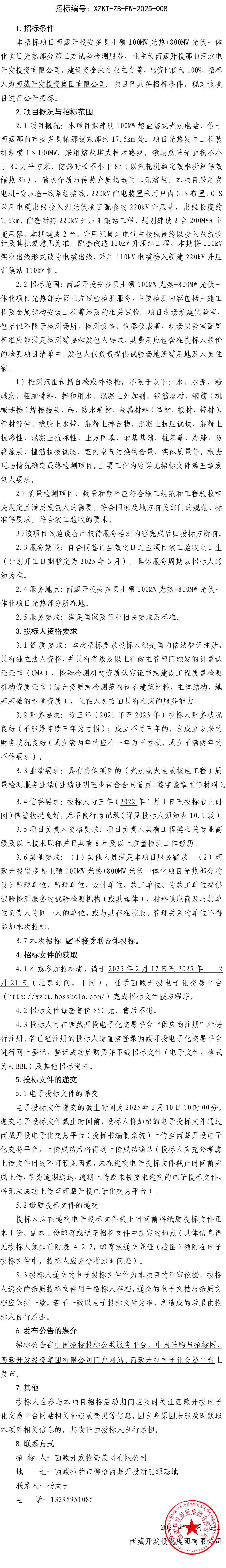 西藏開投安多縣土碩100MW光熱+800MW 光伏一體化項(xiàng)目光熱部分第三方試驗(yàn)檢測服務(wù)招標(biāo)公告
